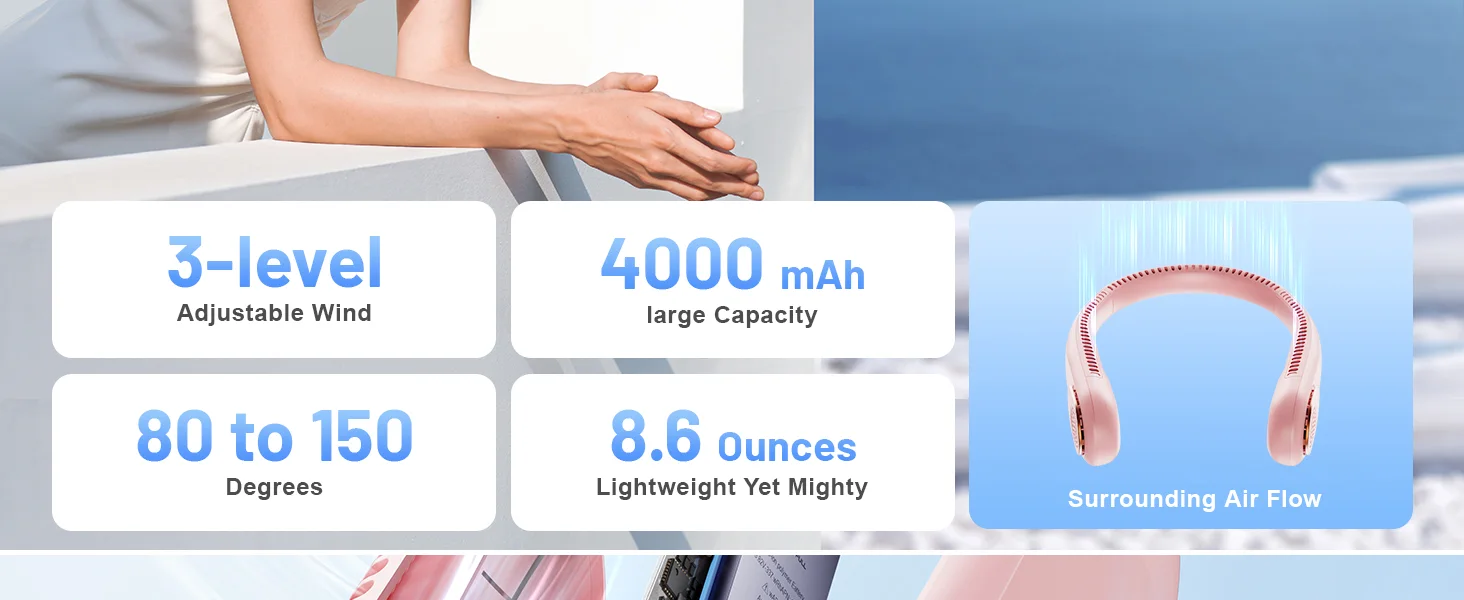 انتعاش يدوم طوال اليوم مع 3 سرعات: مروحة رقبة شخصية قابلة لإعادة الشحن ببطارية 4000 مللي أمبير، تضمن لك تبريدًا مستمرًا من الصباح إلى المساء. يمكنك ضبط سرعة المروحة بسهولة باستخدام زر التشغيل للحصول على نسيم منعش حسب رغبتك.
